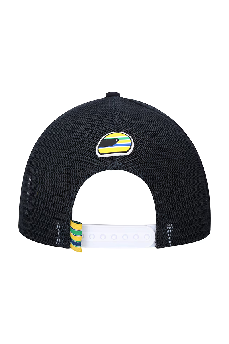 Ayrton Senna Trucker Cap mit Helmet Badge und Mesh-Rückseite. Atmungsaktive F1 Cap im ikonischen Senna Design für echte Fans.