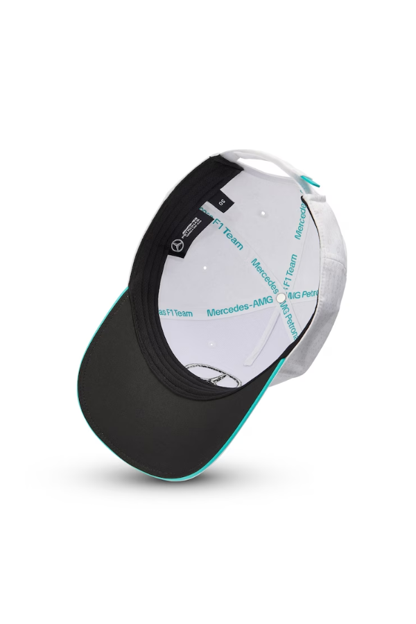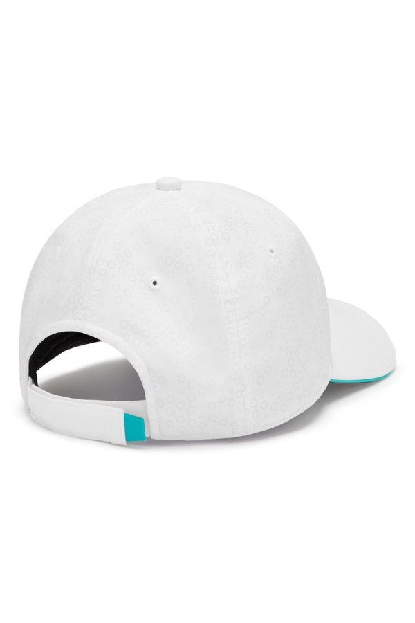 Weiße Baseballkappe aus der neuen Mercedes AMG F1-Kollektion. Diese Kappe wurde speziell für die Fans des Formel-1-Teams entworfen und ist Teil der offiziellen Produktreihe.