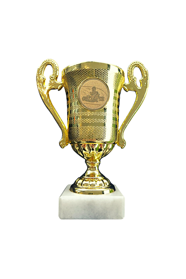 Karting Gold Mini-Trophäe für den 1. Platz des Podiums. Kleines Modell von 15cm hoch auf seinem Steinsockel.