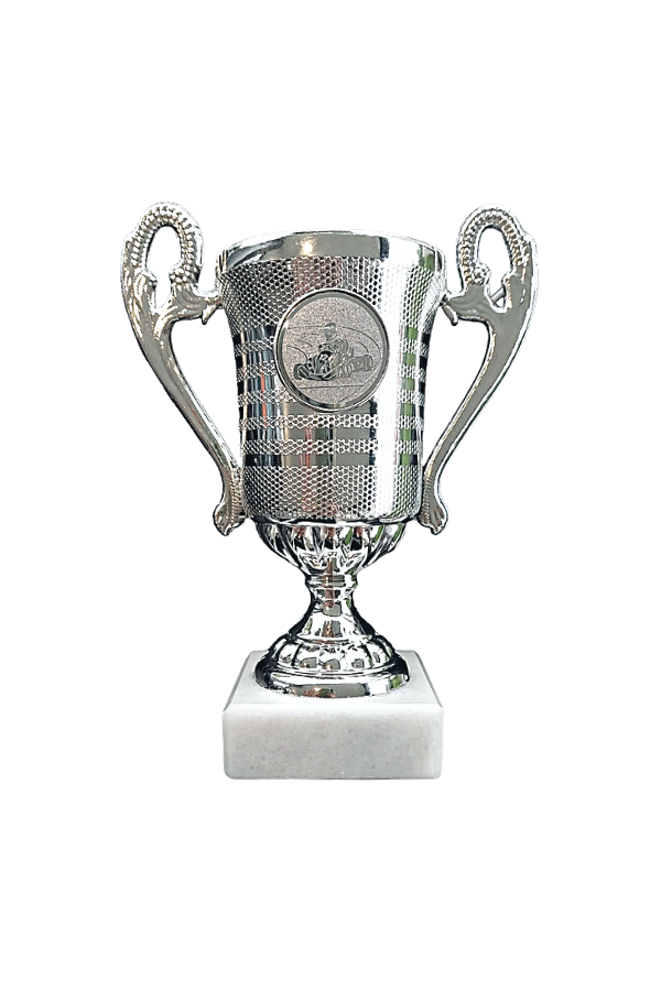 Karting Silber Mini-Trophäe für den 2. Platz des Podiums. Kleines Modell von 15cm auf seinem Steinsockel.