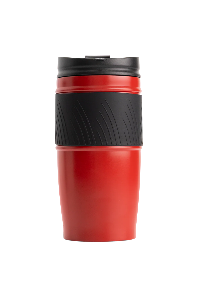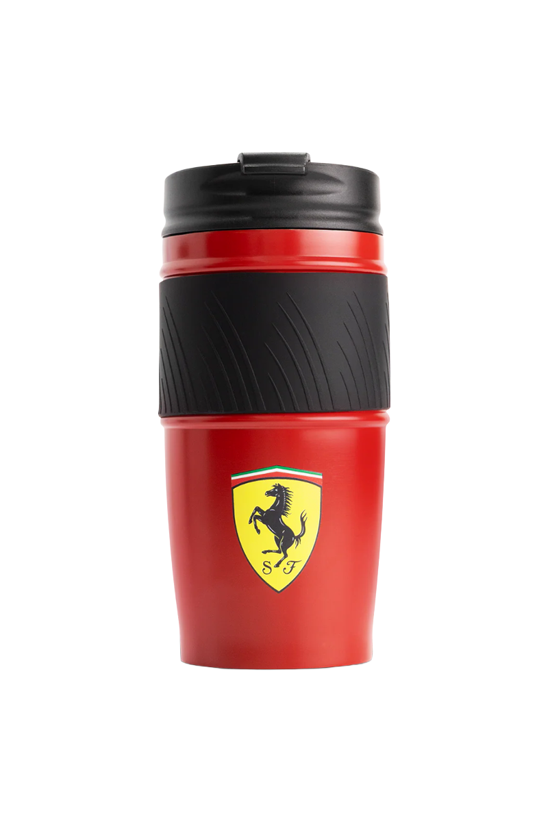 Offizieller Scuderia Ferrari Thermobecher in mattem Rot mit Edelstahlkorpus und Schraubdeckel – hält Getränke heiß oder kalt für Fans unterwegs.