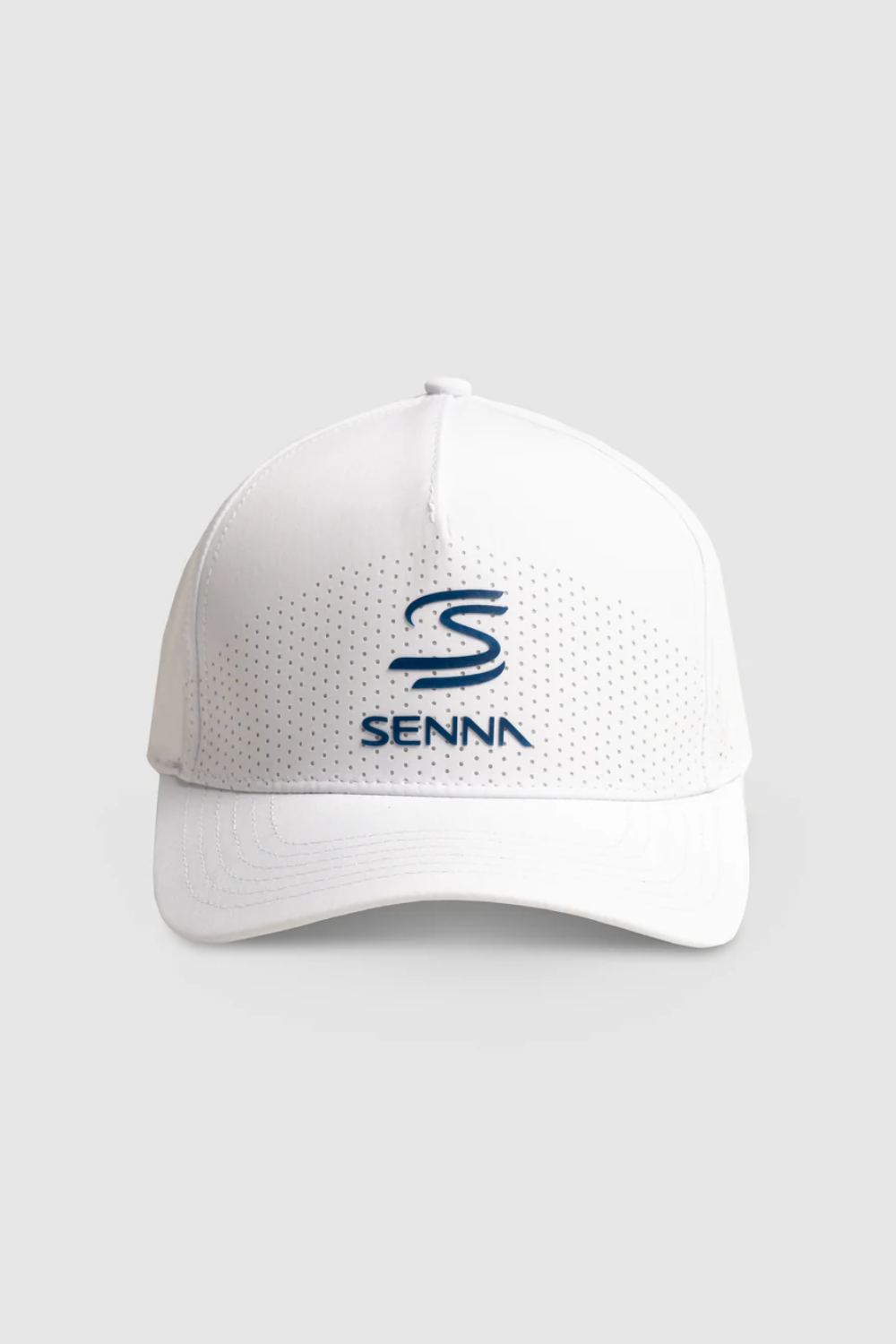 Official white Ayrton Senna Leisure Cap with sweatband, laser-cut vents, raised front logo and velcro fastening. Comfortable, breathable and iconic.