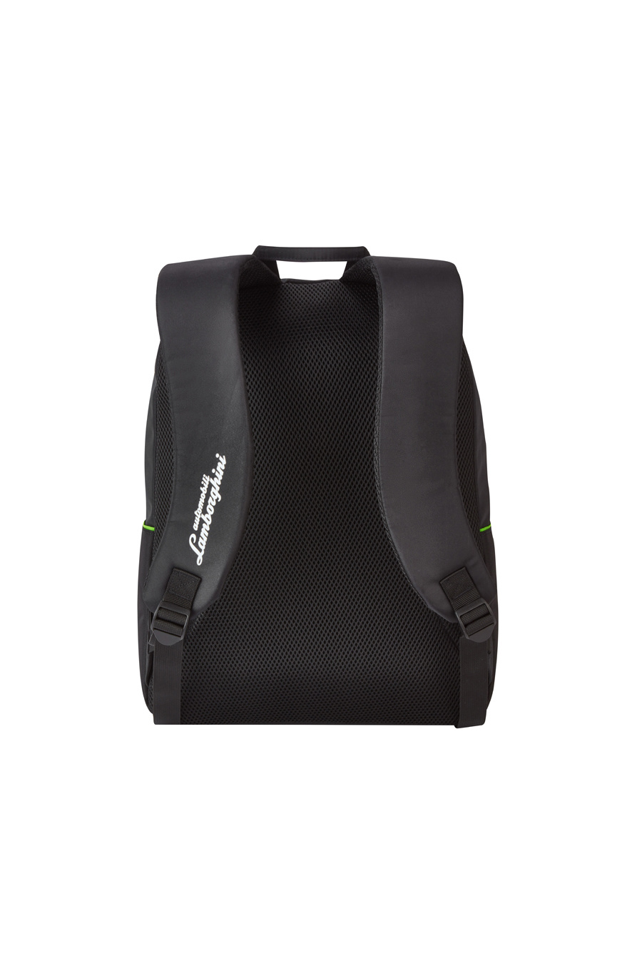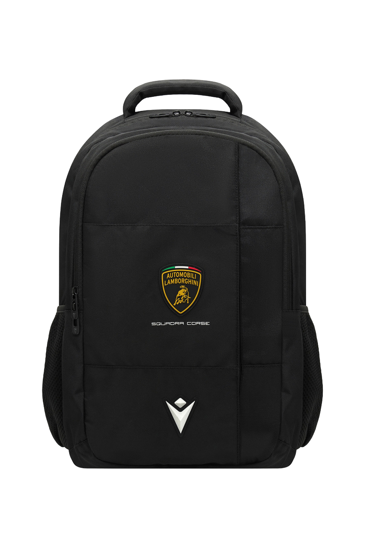 It has two main compartments with a zip closure, a padded section for a laptop or tablet, two comfortable adjustable shoulder straps and two side pockets. It has been embellished with the logo of Automobili Lamborghini Squadra Corse.
