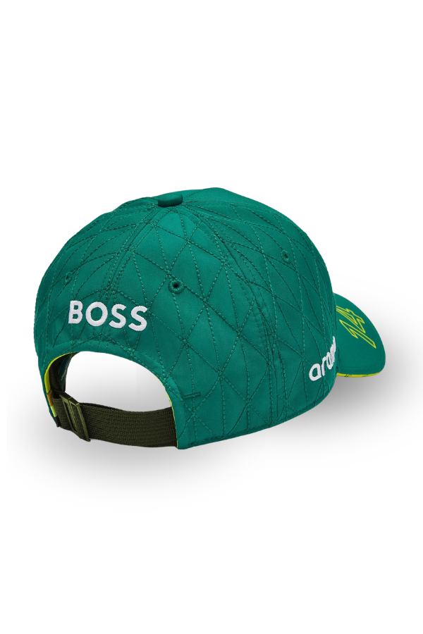 Fernando Alonso Official green cap from the Aston Martin F1 team with the driver's number 14. High-quality, it features Aston Martin car-inspired quilted back panels with all the official 2024 sponsors.