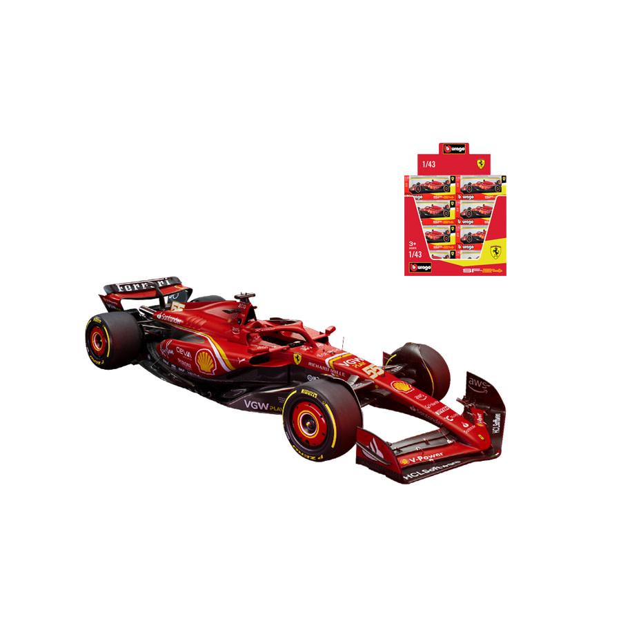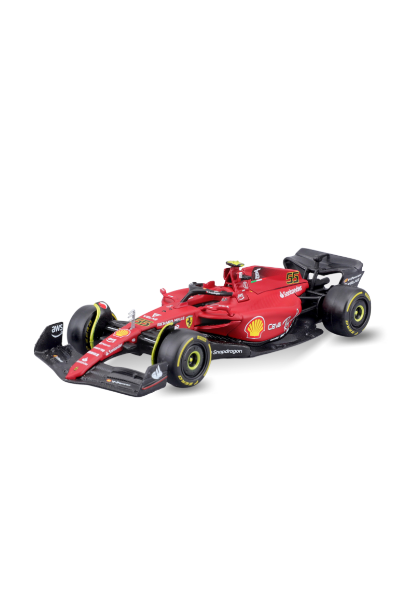 Bburago scale model of the Ferrari F1-75 Team Scuderia Formula 1 car, identical replica to the one driven by the driver Sainz. This car model is at a scale of 1:43 (approximately 13 centimeters long).