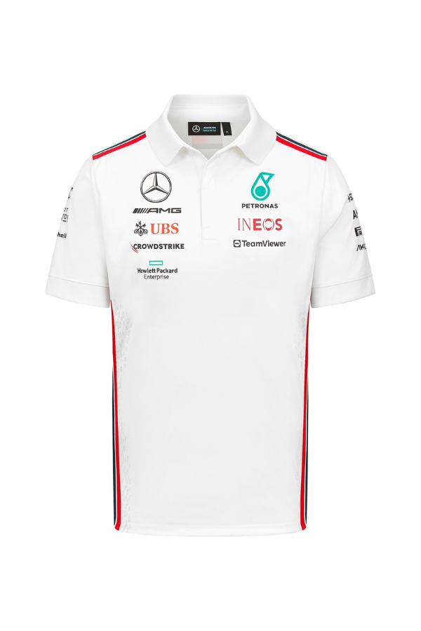 Official white polo shirt of the Mercedes AMG Petronas team for the 2023 Formula 1 season. Choose a stylish and sporty look to support your favorite team.