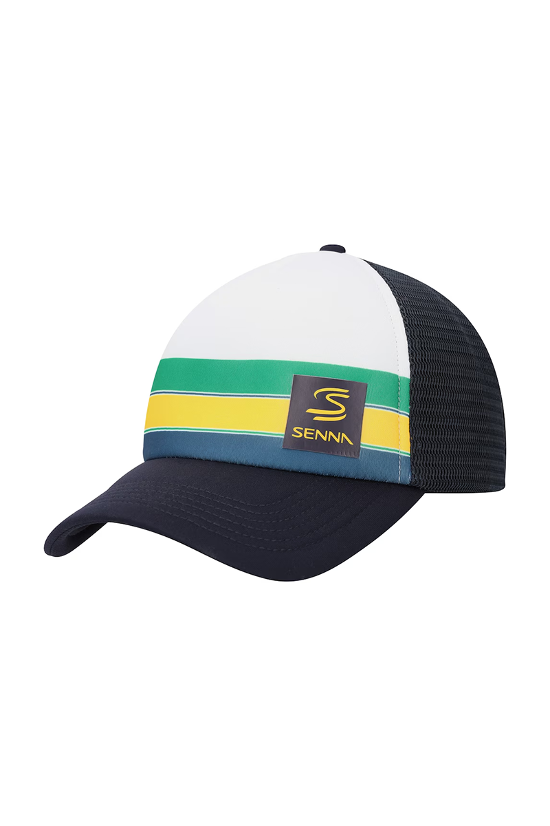 Casquette Ayrton Senna avec badge casque et mesh respirant. Design iconique F1 pour fans de sport automobile.