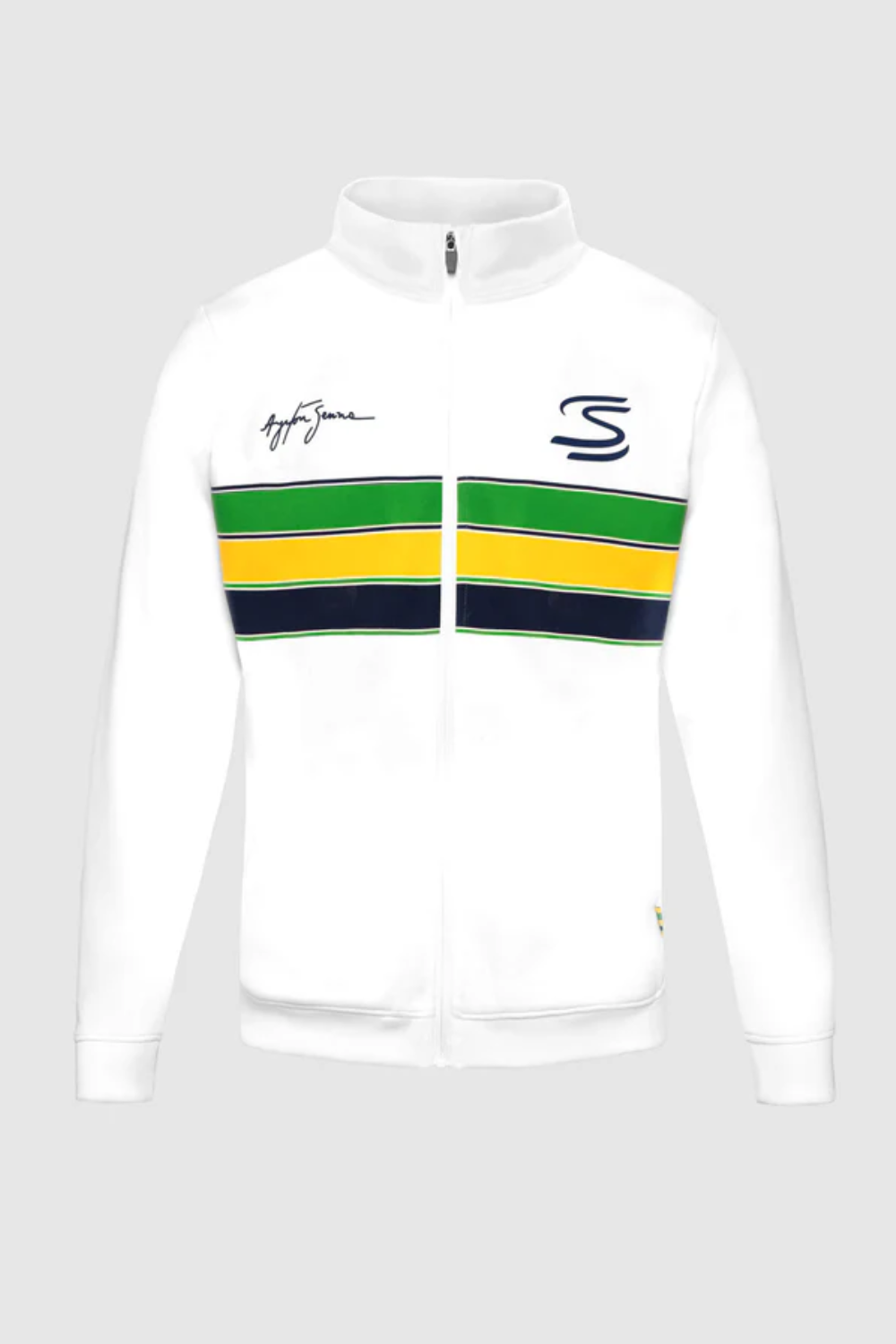 Veste zippée officielle Ayrton Senna en tricot recyclé. Logos en relief, rayures imprimées, poches zippées. Style et confort pour les fans de F1.