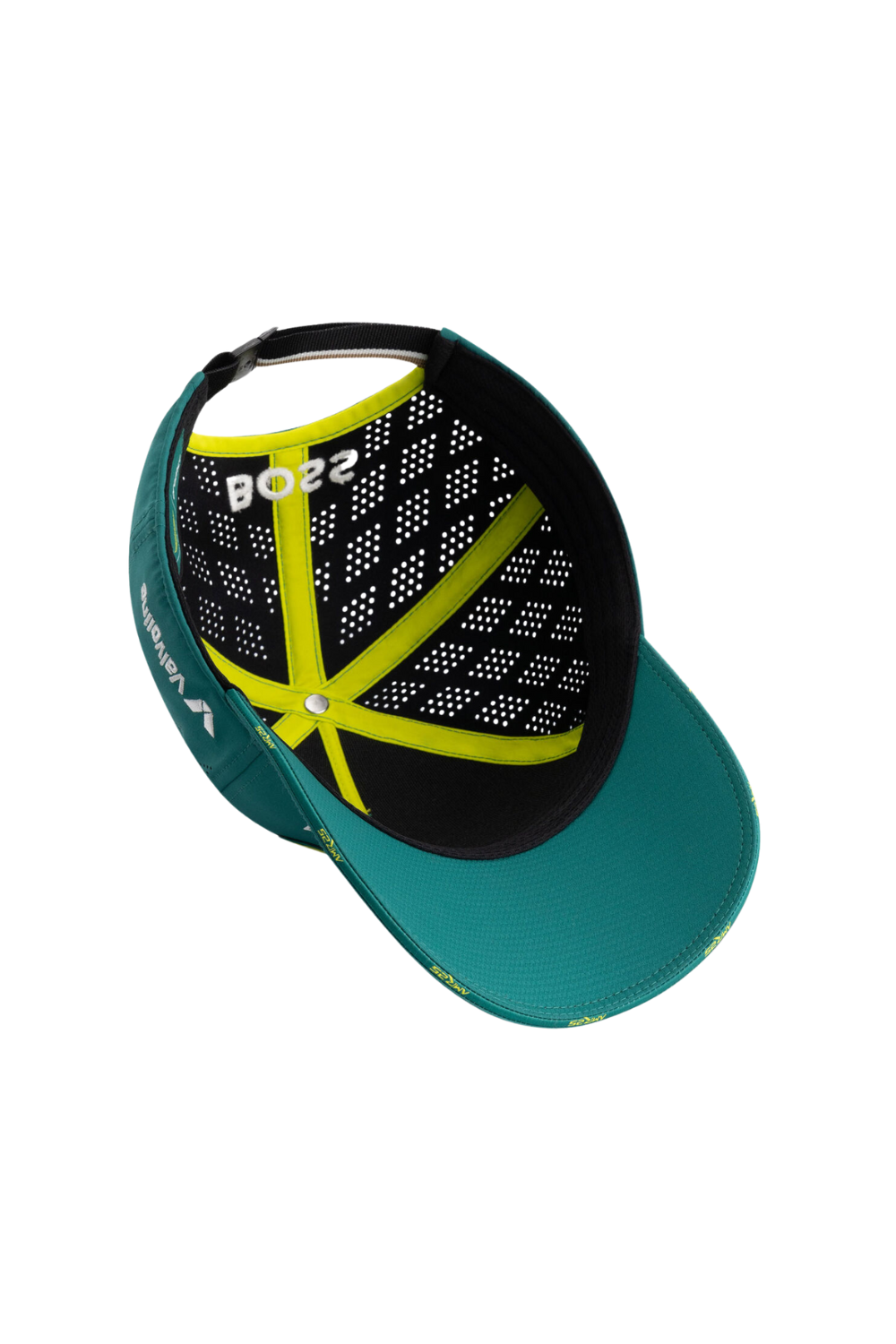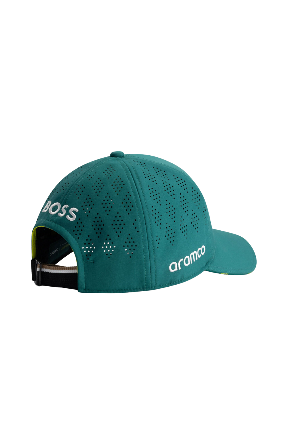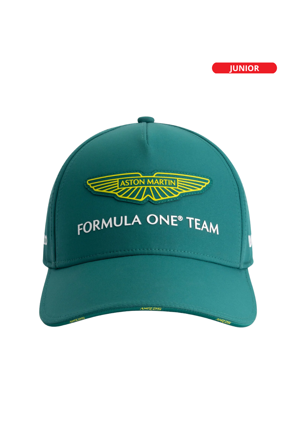 Casquette Enfant officielle Aston Martin F1 2025 en vert, avec détails AMR25 et logos partenaires.