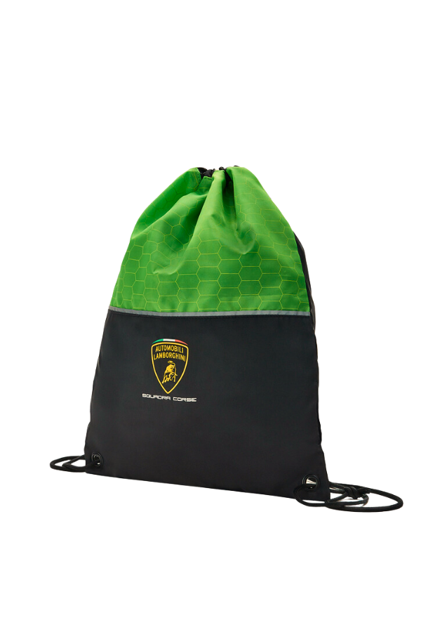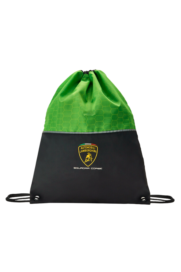 Sac à cordon officiel Lamborghini : élégant et fonctionnel. Emblème Squadra Corse, design géométrique vert, couture réfléchissante. Idéal pour la ville ou le sport !