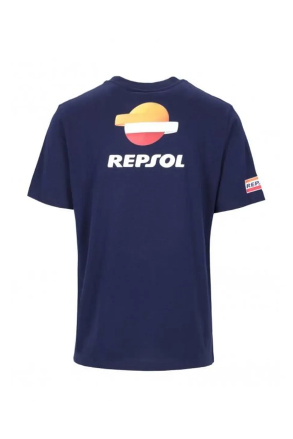 T-shirt Repsol bleu foncé à manches courtes pour tous les fans de MotoGP. Logos Honda et Repsol, avec une ligne tricolore qui s'étend jusqu'au dos. Coupe droite très confortable en 100% coton.