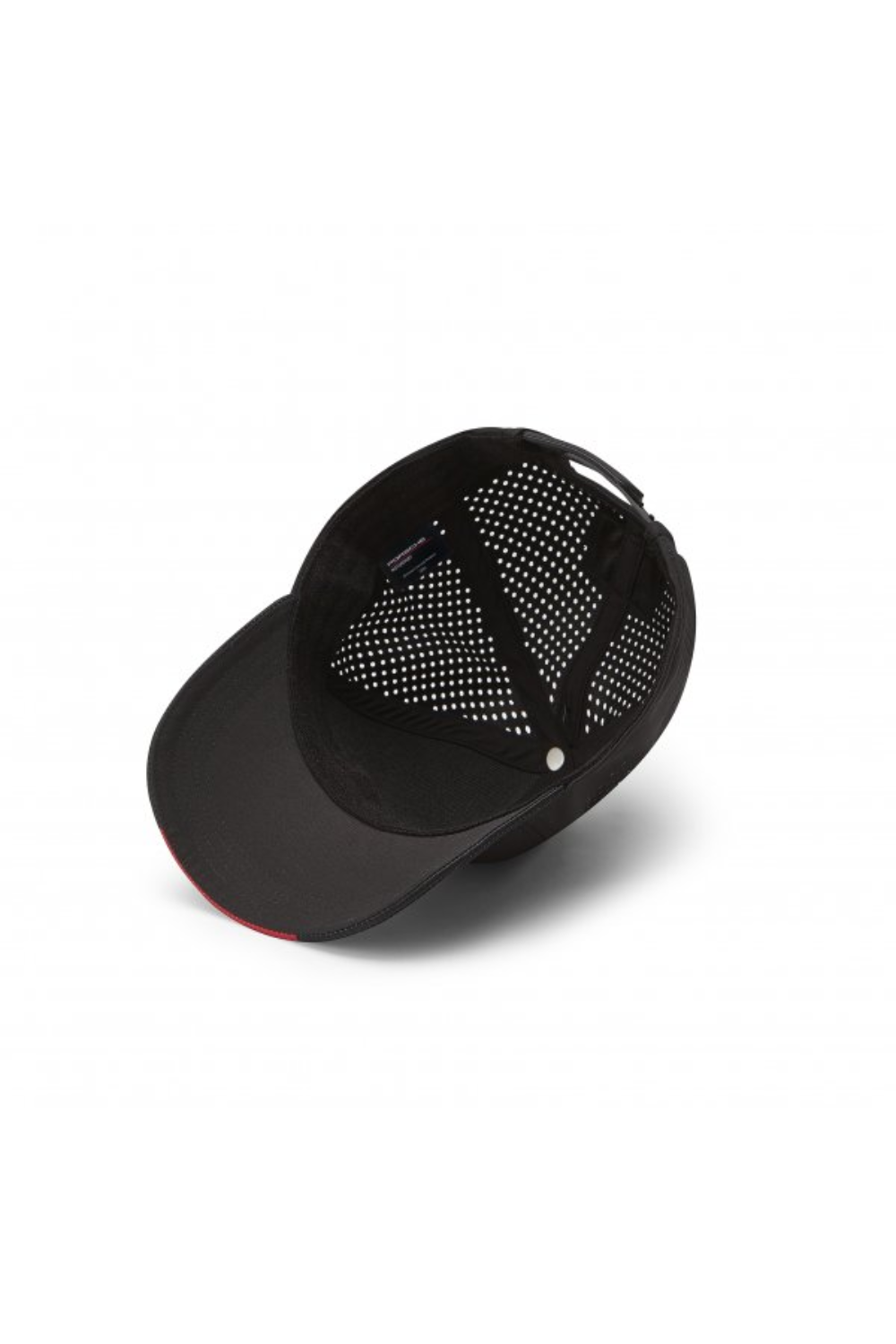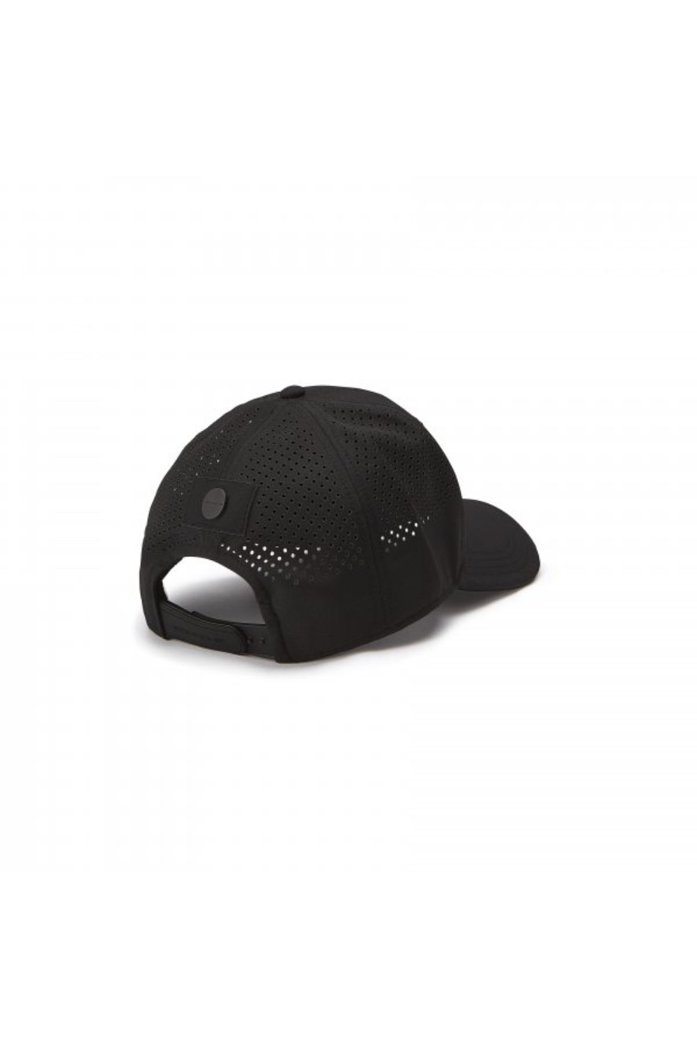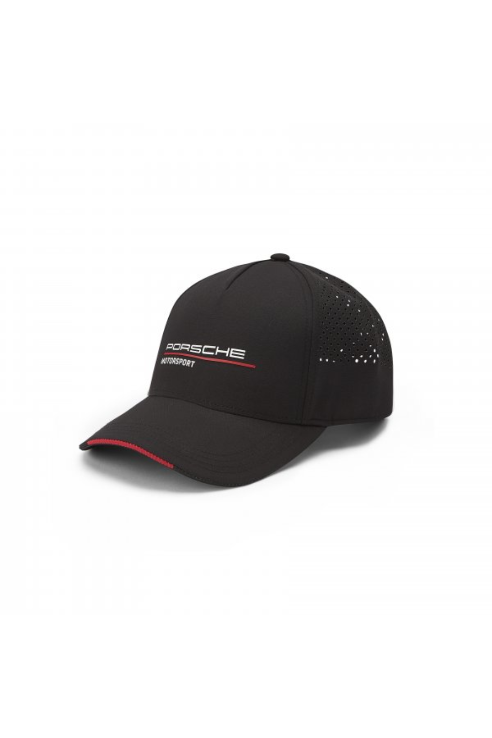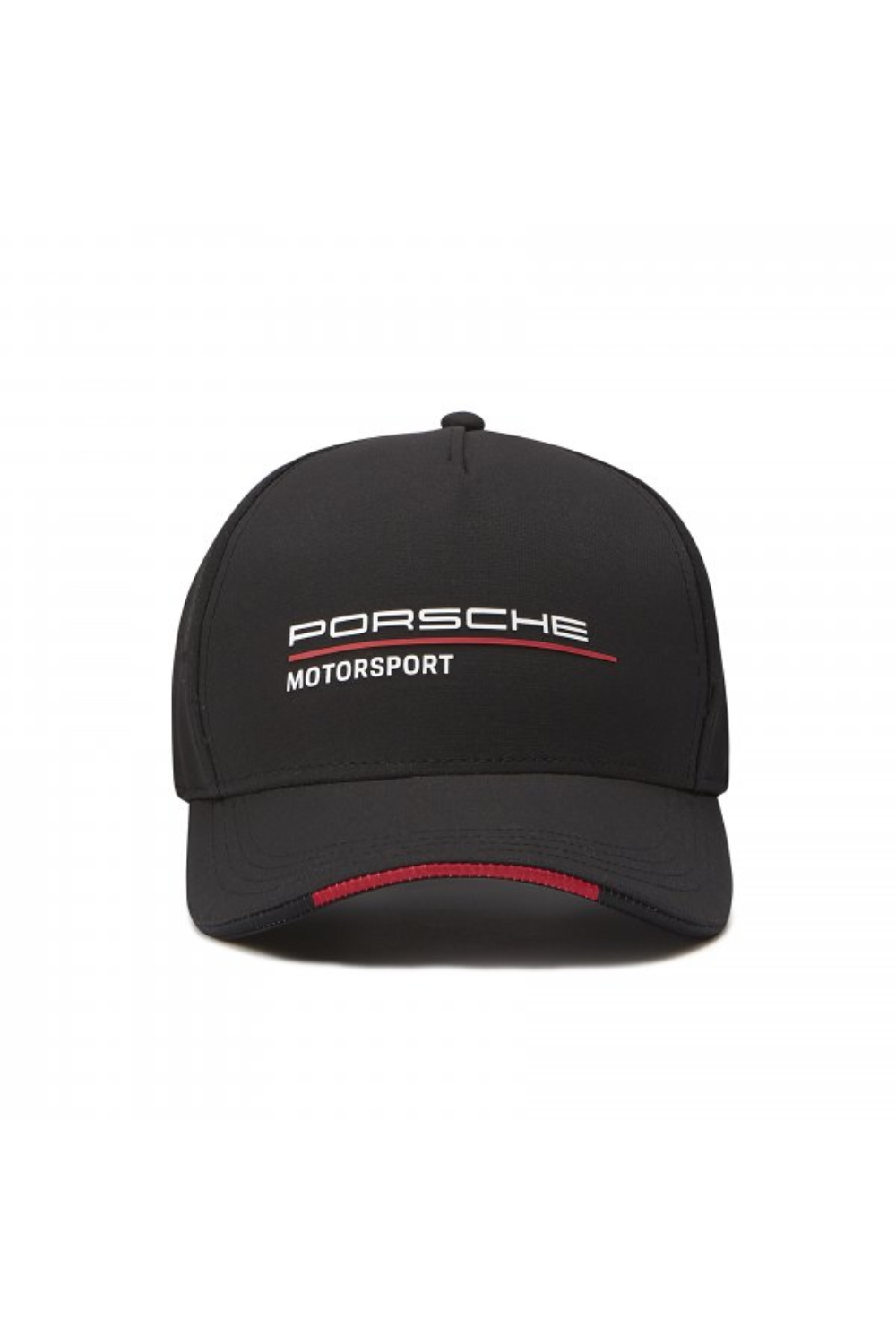 Casquette sportive de l'équipe de course Porsche Motorsport de couleur noire. Les logos à l'avant et à l'arrière ressortent légèrement, ce qui en fait un véritable accroche-regard. Sur le devant figure le logo Porsche Motorsport.