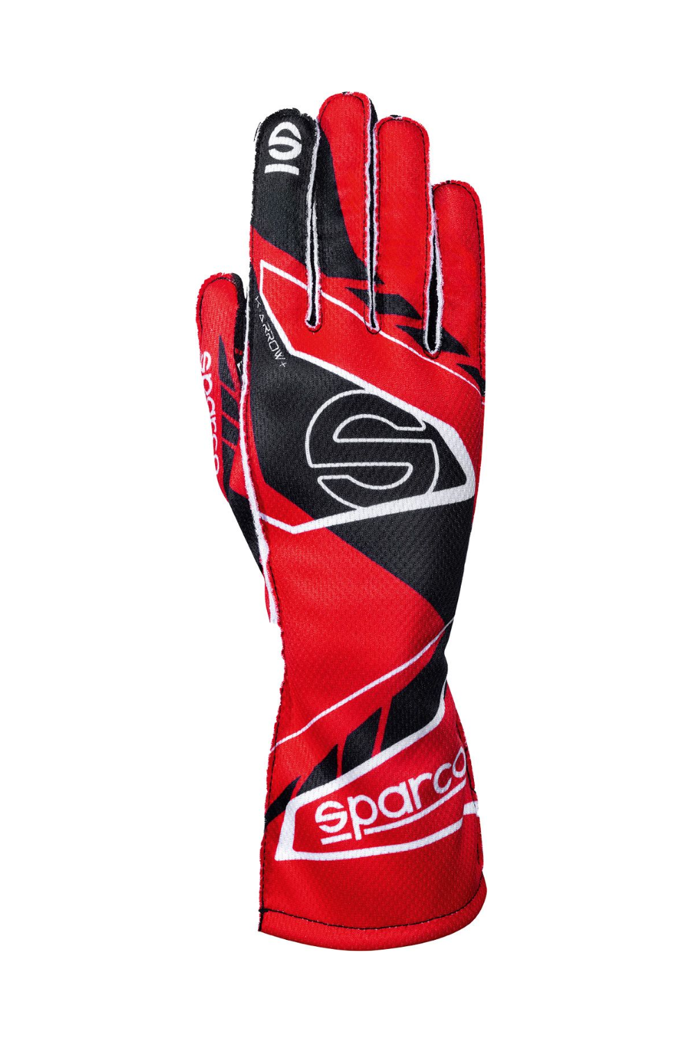 Gants Sparco K-Arrow+ Rouge/Noir FIA 8877-2022. Paume préformée avec grip HTX pour un meilleur contrôle. Tissu respirant, coutures externes et ajustement élastique pour un confort optimal.