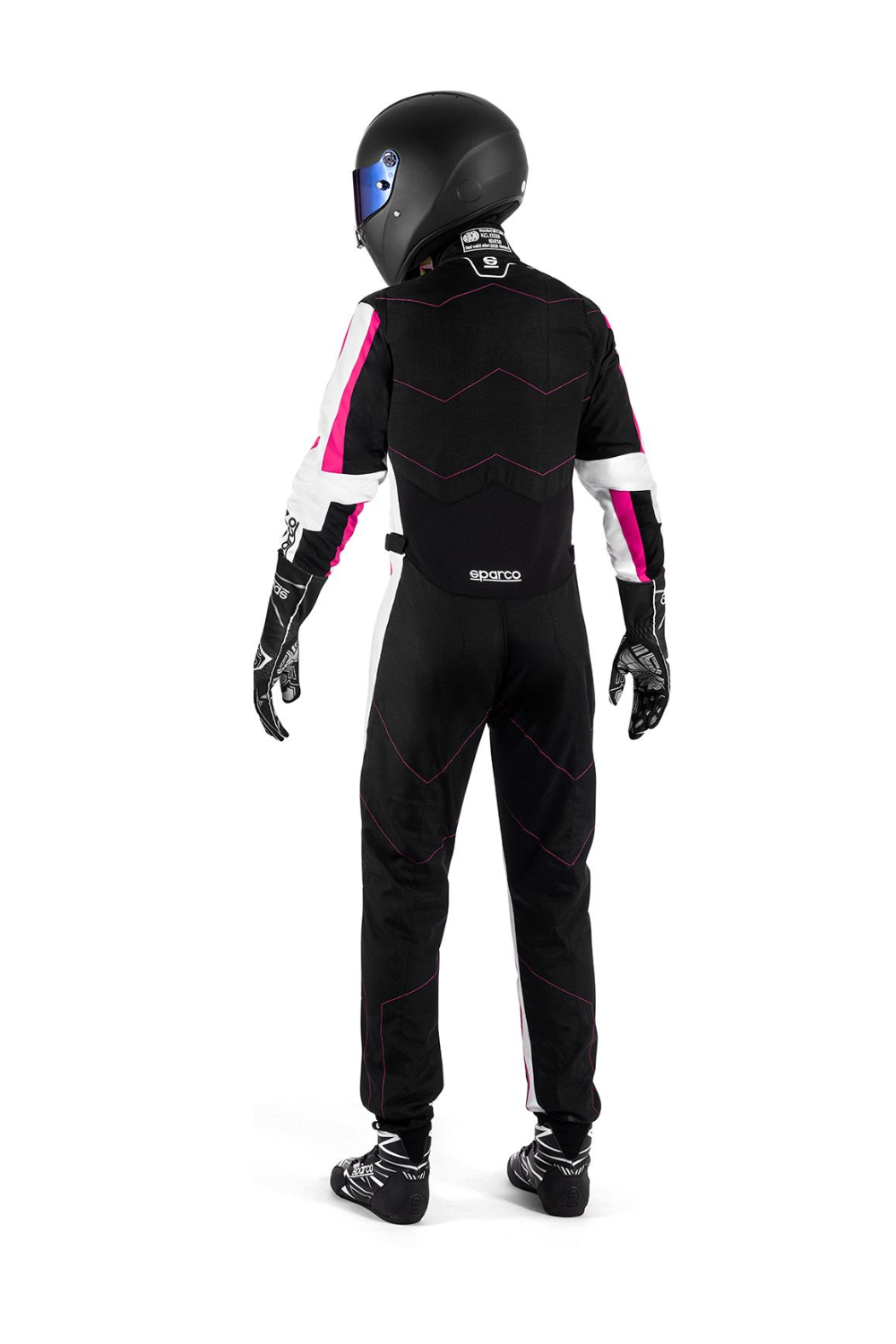 Sparco Kartoverall Kerb Advanced Lady noir et rose, combinaison de karting ergonomique pour enfants. Liberté de mouvement optimale, ventilation ciblée, taille ajustable et design sportif. Conforme FIA 8877-2022.
