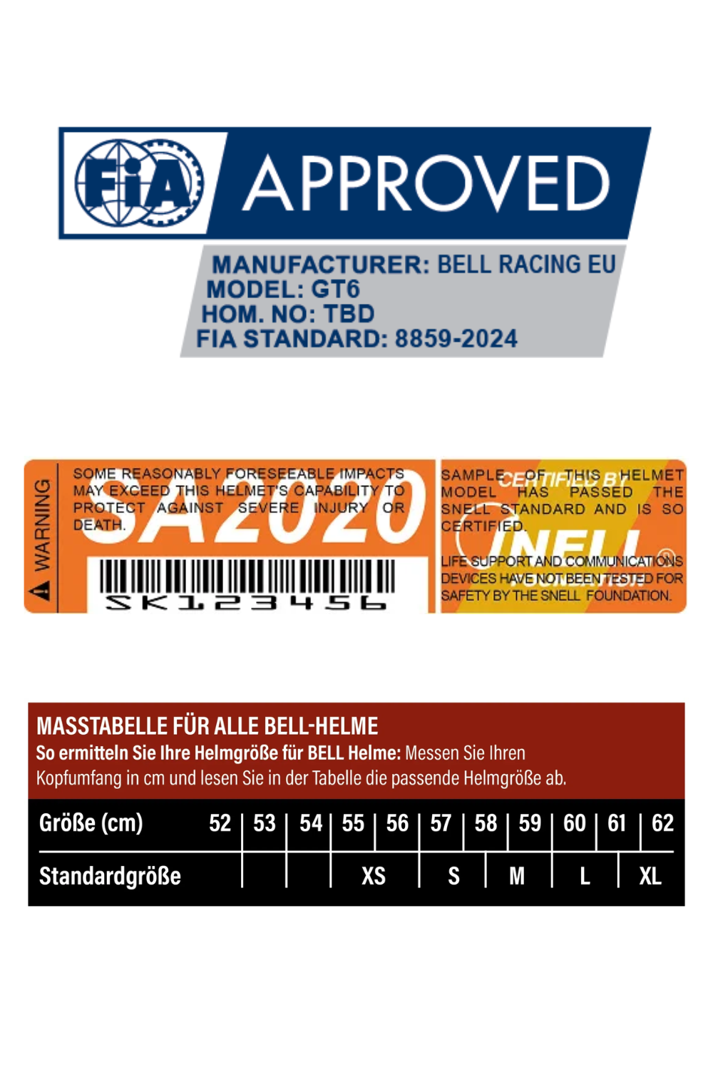 De Bell GT6 Pro voldoet aan de FIA 8859-2024 en SNELL SA2020 normen, wat het een betrouwbare keuze maakt voor professionele coureurs.