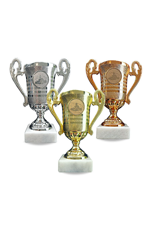 Karting mini trofee. Verkocht per 3 stuks. Klein model van 15cm hoog op zijn stenen voet.